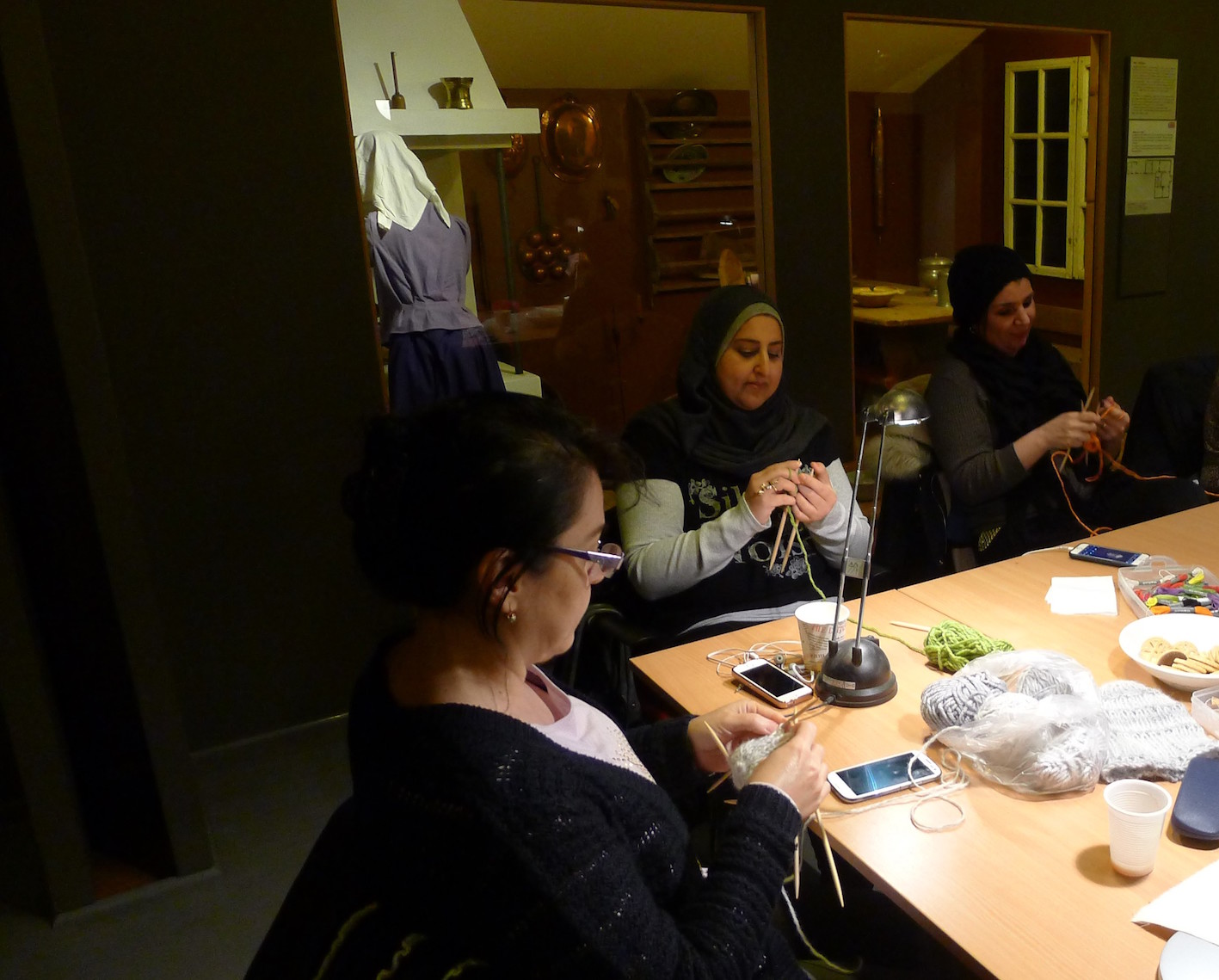Fredag 24 november satt de i kjøkkenutstillingen på Bymuseet, i museets åpningstid, og arbeidet med diverse tekstiler. Da brukte de også en gammel Singer symaskin, som er tilnærmet lik den modellen vi har i den byhistoriske utstillingen vår. Det var denne symaskintypen Kateryna Bukhantsova skrev teksten sin om, og som flere av deltakerne i det første prosjektet stanset opp ved. Det kom flere besøkende innom og snakket med kvinnene som satt der og jobbet, stemningen var god. Prosjektlederne Reidun A. Johannessen og Gro Røde forteller at de opplevde at utstillingen fikk tilføyd liv og dimensjoner, i tillegg til at det ble dialog mellom deltakerne og publikum og museets ansatte. Utstillingen ble en møteplass.